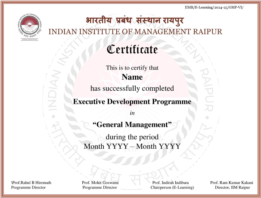 Disclaimer: *All certificate images are for illustrative purposes only and may be subject to change at the discretion of IIM Raipur.